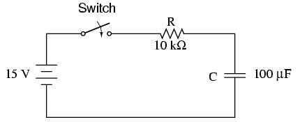 Let's see how this all works on a real example circuit. Taking the same resistor-capacitor circuit from the beginning of the chapter, we can work "backwards" from previously determined values of voltage to find how long it took to get there.